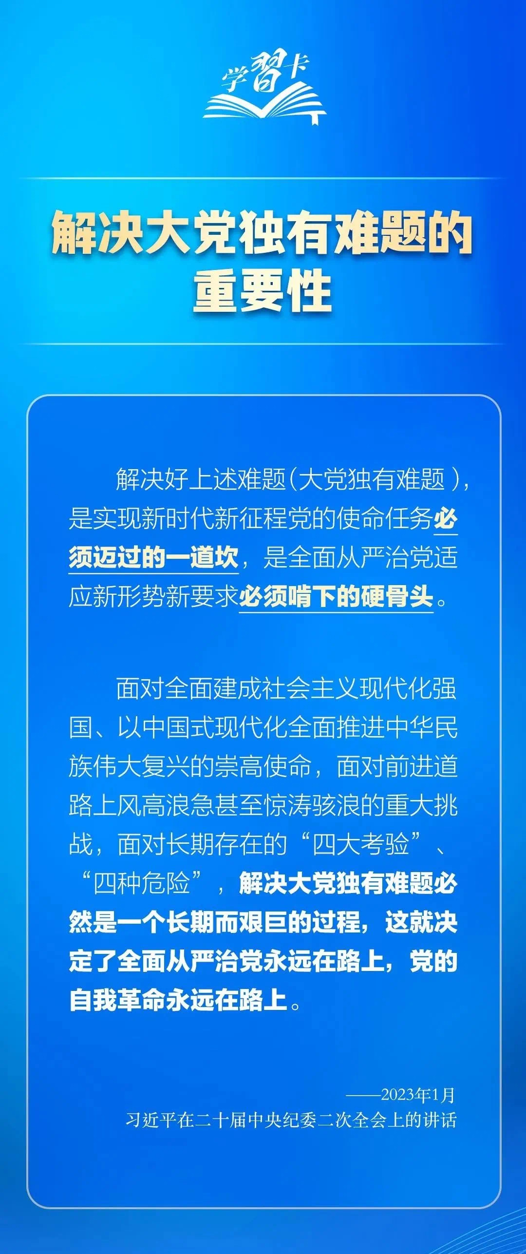 习近平总书记在不同场合多次强调全面从严治党、党的自我革命的重要性。解决好大党独有难题,是实现新时代新征程党的使命任务必须迈过的一道坎,是全面从严治党适应新形势新要求必须啃下的硬骨头。