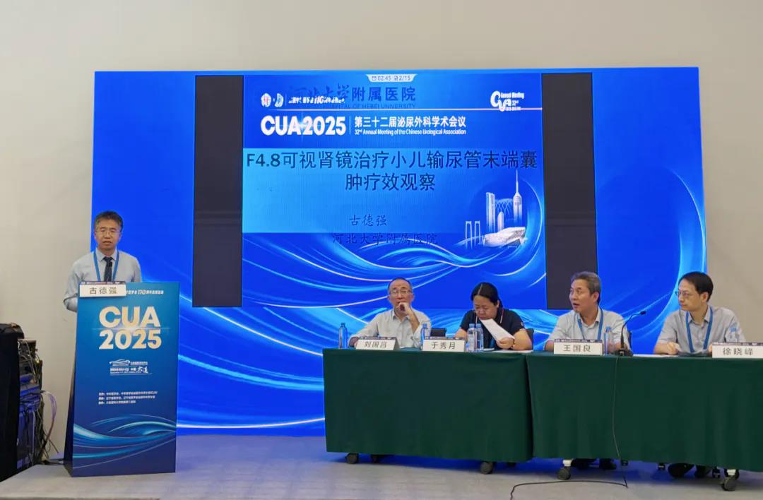 会议期间,古德强参与小儿泌尿专场的多项学术环节,以《F4.8可视肾镜治疗小儿输尿管末端囊肿疗效观察》为题,系统介绍了该微创技术的临床应用及相关疗效观察,内容详实、观点鲜明,引发了与会专家的广泛关注。此外,他还担任了该专场部分环节的会议主持,积极参与现场学术互动与专业点评。