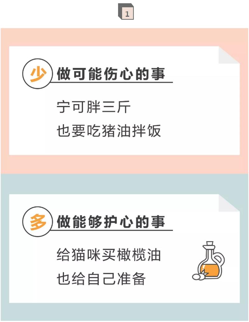 解释:动物油富含饱和脂肪酸,而植物油富含不饱和脂肪酸,可帮助降低血液中坏胆固醇水平,调节血脂、清理血栓,降低心脏病和中风的风险,相对而言更健康些,做饭时可选择橄榄油、花生油等植物油,以每日20~30g(一般吃饭用勺3勺左右)为宜。