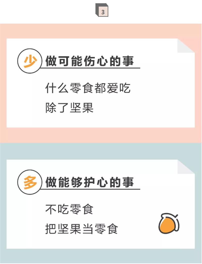 解释:核桃、榛子、开心果等坚果富含维生素和有益健康的脂肪酸,研究发现,每周吃3次或3次以上的坚果,每次约30g(单手抓一把的量),可降低心脏病患病风险。