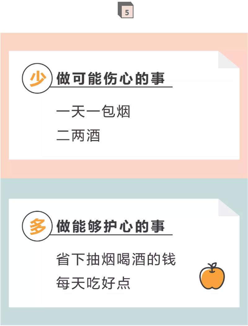 解释:每周3~5次低、中等强度的运动,有助于增加心脏功能,改善血管弹性,增强机体对心血管疾病的耐受性,保护心脏。