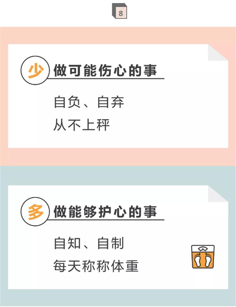 解释:超重(BMI*≥24)、内脏脂肪性肥胖(VA**≥100cm2 )或体脂率过高(男性≥25%,女性≥35%)均是心血管疾病的重要危险因素,控制体重在健康范围内可预防高血压、改善脂代谢和血小板功能,是预防心脏病最简单的办法。