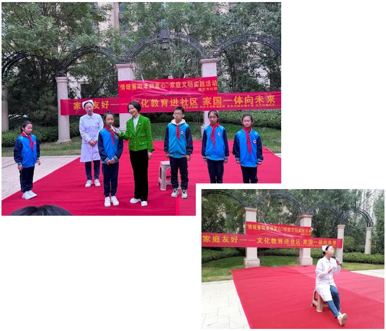 师生送文化,医护送健康。10月9日,保定市新市场小学工会主席杭亚娟作为领队,带领“保定责任”新小师生健康工程健康专家、生命教育课程导师、副主任医师、河北大学附属医院(以下简称“河大附院”)老年医学科副主任谭莉莉,“保定责任”新小师生健康工程健康专家、康复医学课程导师、副主任护师、河大附院康复医学科病区护士长刘涓及师生代表,一同走进玉兰花园社区,面对社区居民与楼道长代表,社区工作者与志愿者代表等,以《科学养老幸福延年之孝老、敬老新小学子与您一起行动》为主题,开展医媒教跨领域融合孝老敬亲公益文化教育与健康宣讲及医护协同义诊服务。保定市新市场小学德育副校长魏帅、玉兰花园社区党支部书记王海青全程参加,保定市妇联常委、新市场小学健康副校长魏巍全程主持,新市场小学德育处主任赵子政全程做服务保障。