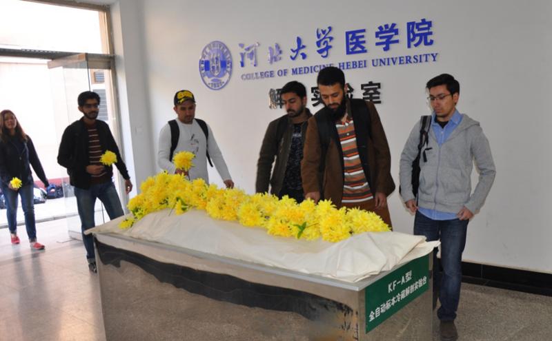 近日,河北大学2018年春学期招收的临床医学专业留学生班,首次在医学院全英文授课学习人体解剖学专业课程。医学院副院长王红杰、国际交流与教育学院老师和教务科老师到场参加此次教学活动。