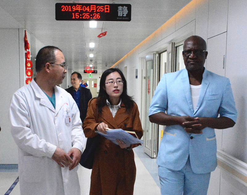 4月25日下午,在河北省卫健委科技教育与国际合作处张碧馨的陪同下,刚果(金)中刚友谊医院院长吉斯卡特·卡邦戈·达哈布到我院参观访问。我院院长张海松与达哈布院长进行了友好交流。