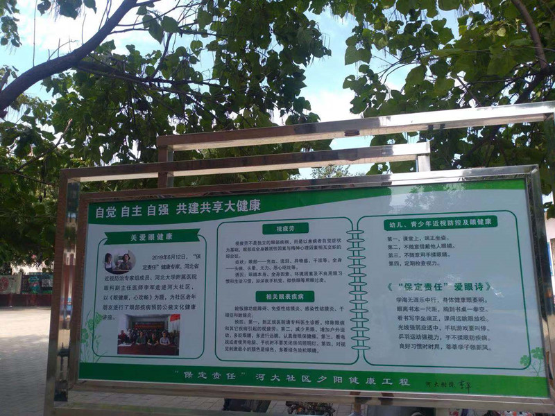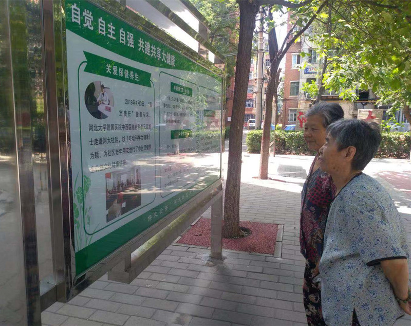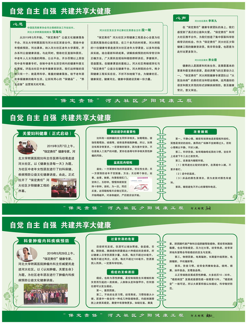 据了解,河大社区公益文化健康广场以“自觉 自主 自强 共建共享大健康”为宗旨,是“保定责任”河大社区夕阳健康工程的重要组成部分。从今年3月份开始,河大社区与“保定责任”公益文化健康服务平台、我院深度合作,围绕中老年慢病预防,列出课单,纳入河大社区老年大学课程,开办系列公益健康讲座。我院妇科、呼吸内科、心血管内科、中西医结合科、神经内科、骨外科、内分泌科、肿瘤内科等11位健康专家先后走进河大社区老年大学课堂,传播健康常识,讲解疾病预防的方法。合作过程中,河大社区与“保定责任”策划团队、健康专家团队积极协商,以健康课堂为基础,打造公益文化健康广场,将日常社区居民最为关注的健康常识进行集中传播。