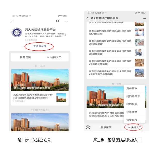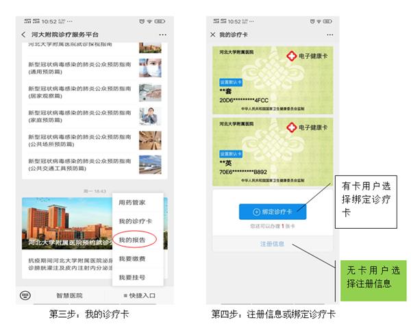 二、没有我院诊疗卡或未将诊疗卡与微信进行绑定的用户,预约前先进行如下操作,之后按预约提示进行预约挂号: