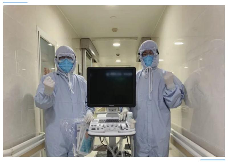收入隔离病房的肺部感染患者,有些合并胸腔积液,如果积液量大则会引起患者呼吸困难,甚至会造成患者生命危险。在隔离病房里,一位79岁老年患者出现呼吸困难,张红强用超声查看患者情况后发现右侧大量胸腔积液,请示梁璐主任后需行胸腔穿刺。胸腔穿刺是一个常规诊疗操作,但在隔离病房里,严密的防护措施给穿刺增加了难度和障碍,常规隔离是两层手套,穿刺时还要多加一副无菌手套,在超声定位和穿刺时要通过满是蒸汽的护目镜确认位置尤其困难。整个操作下来,贴身衣服已被汗水浸湿,汗水流入眼睛里,刺激得生疼,他只能忍着,但看到胸腔积液引出后患者呼吸困难明显好转后又为自己感到骄傲和自豪。