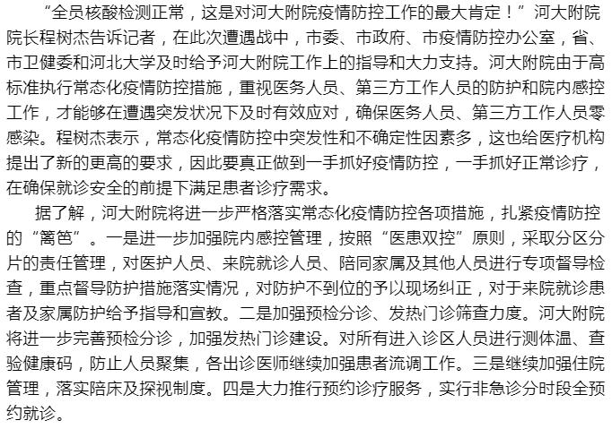 河大附院全员核酸检测正常,市民可放心前往就医