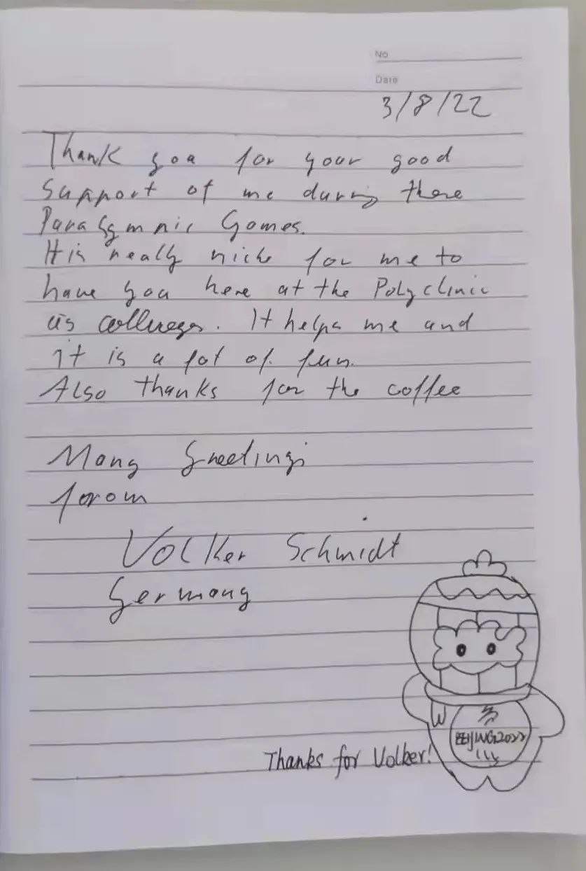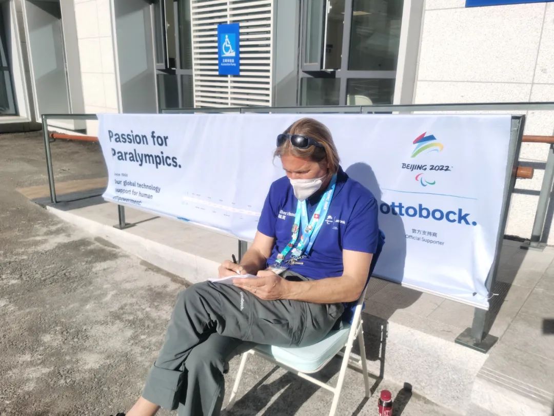 来自德国奥托博克的沃尔克?史福克,是负责冬残奥会中提供和维修假肢、护具的外籍工作人员,史福克是这个领域“专家”级工作人员,在业界有着极高知名度和良好声誉,也是为数不多有资格在综合诊所诊疗区域活动的外籍工作人员,因而可以近距离观察中国医务人员的诊疗。这天下午,沐浴着阳光,史福克在我院留言簿上写道:非常感谢各位在冬残奥会期间为我提供的帮助。各位的尽力协助让我觉得你们就是我在综合诊所的同事,让我有了一段很有趣又难忘的经历。