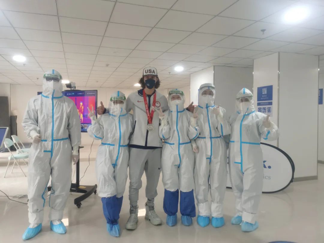 一名美国运动员脚部不适来诊,消化内科护师马娟与杨宝军测量生命体征,急诊医学科主治医师刘鹏问诊及查体,CT-MRI诊断科技师杨磊为其行足部X线检查。该运动员专门佩戴在北京冬残奥会上获得的奖牌前来,他表示非常愿意与综合诊所的医务人员分享这份喜悦。