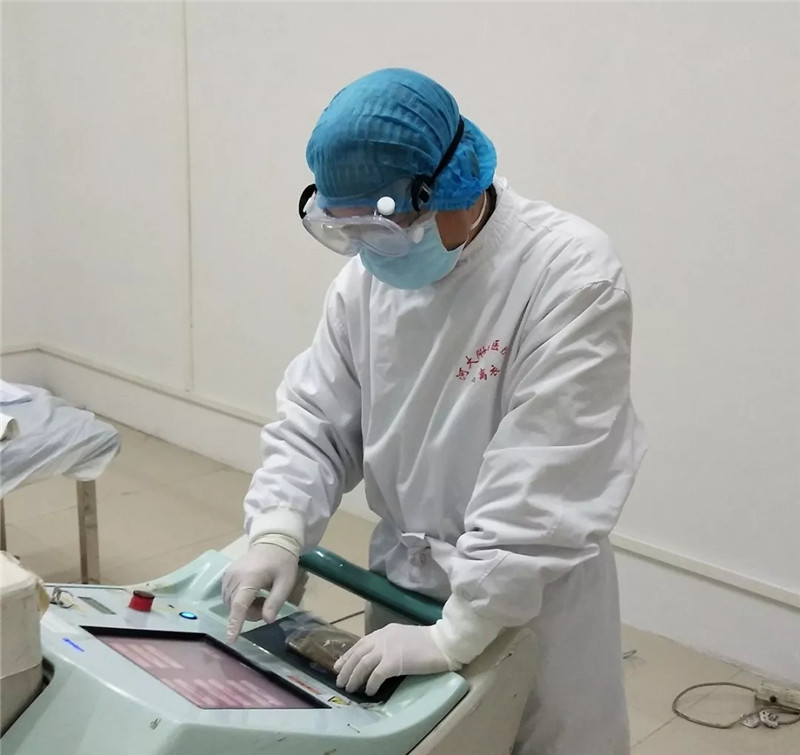 “移动DR是一个热源,随着检查患者数量的增加,机器球管就会越来越热,散发出来的热量就明显增加,穿着密不透风的防护服在不断增加热量的放射室工作,每天不到中午,里面的刷手衣就已经被汗浸透了,护目镜上全是蒸气,加大了我们的工作难度,但没有一个人抱怨,现在我们能做到的是保证每一位患者的检查结果准确无误,希望做好抗疫一线的‘眼睛’,让病毒‘无处遁形’”。赵建喜如是说。