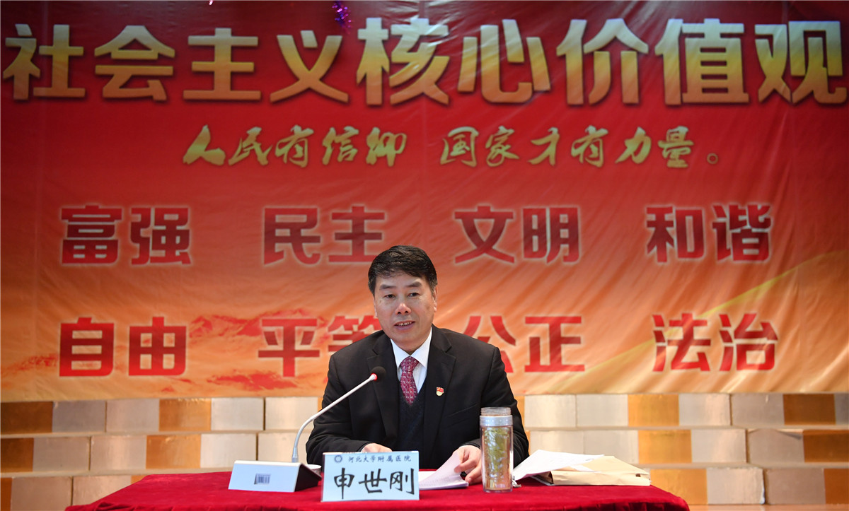 申世刚强调,在我国科技、经济飞速发展、竞争日益激烈的新形势下,除了要有为共产主义事业奋斗终身的满腔热忱外,还需要不断提升自身的政治素质、业务技能、保障能力和服务质量,要深刻理解党的十九大精神的思想精髓和核心要义,准确把握习近平新时代中国特色社会主义思想的丰富内涵和精神实质,牢固树立全心全意为人民服务的宗旨意识和以医疗服务为中心的思想,以良好的精神状态和优质的服务工作,为医院发展战略提供坚强的后勤保障。