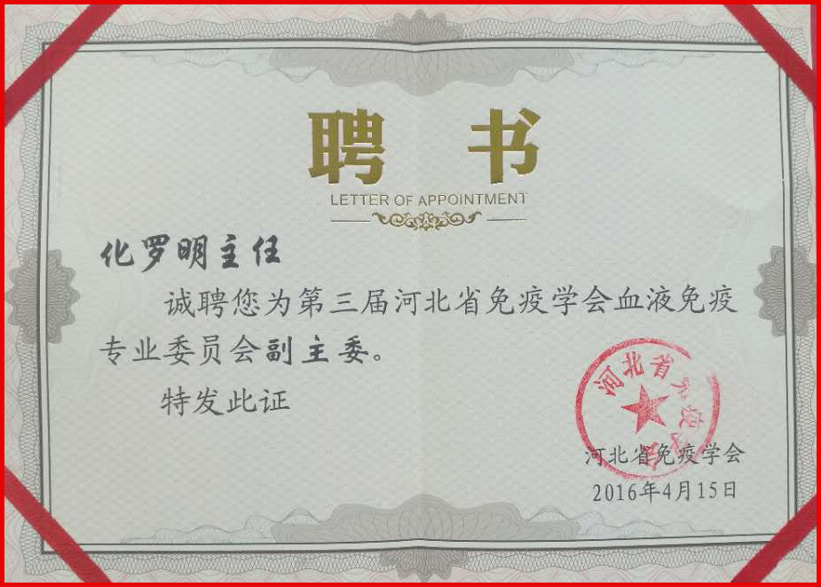化罗明教授被选为第三届河北省免疫学会血液免疫专业委员会副主委。