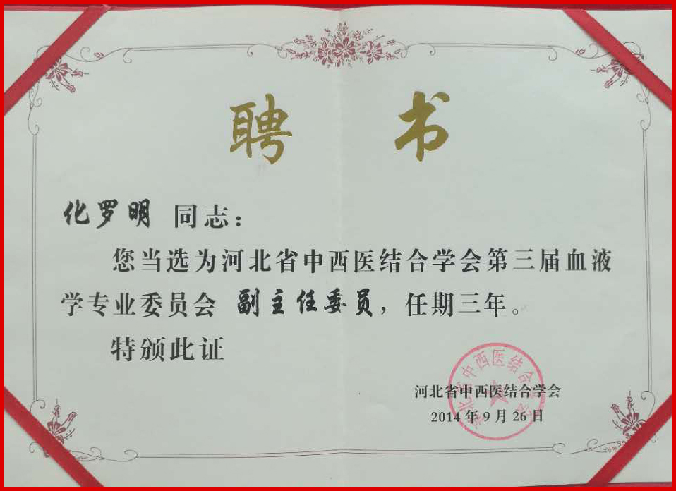 化罗明教授被聘为河北省中西医结合学会第三届血液学专业委员会副主任委员。