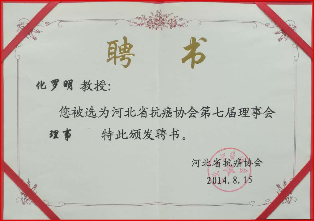 化罗明教授被聘请为河北省抗癌协会第七届理事会理事。