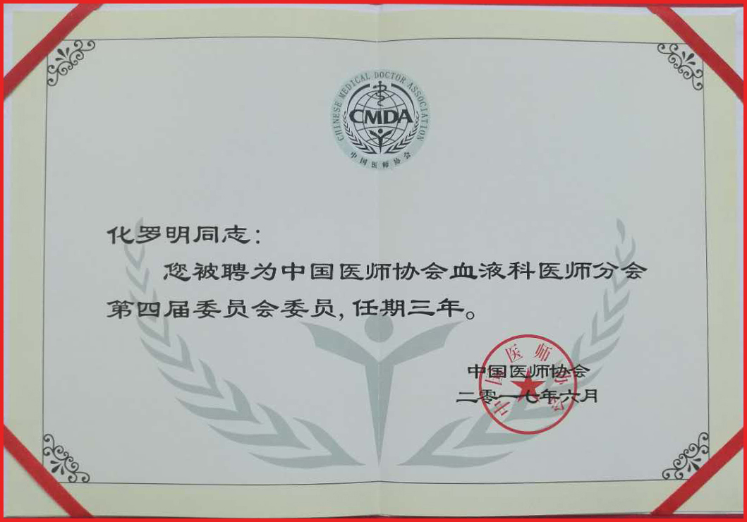 化罗明教授被聘请为中国医师协会血液科医师分会第四届委员会委员。