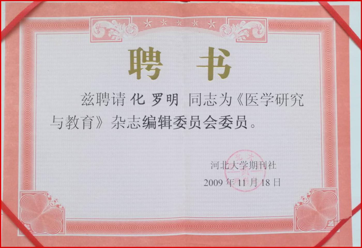 , 化罗明教授被聘请为《医学研究与教育》杂志编辑委员会委员。