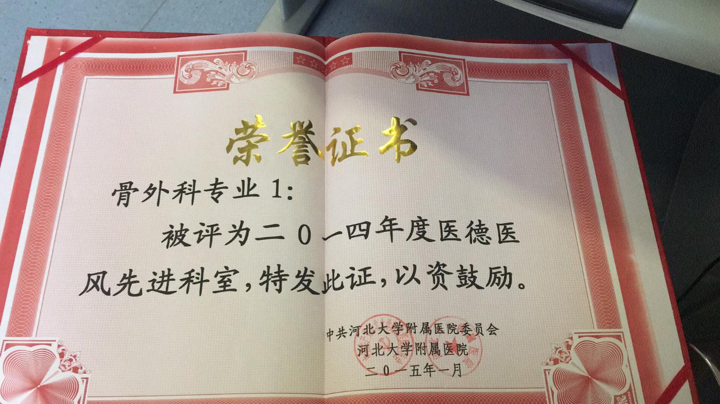 , 骨1科被评为2014年度医德医风先进科室。我们会继续努力,争取更好成绩,..