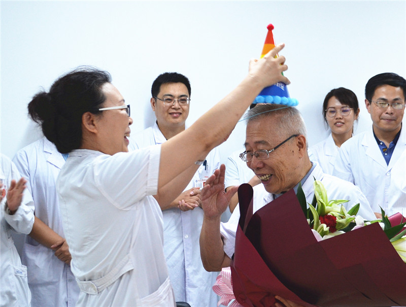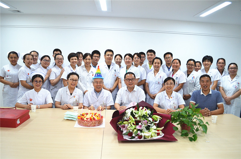 我院党委副书记陈冰带领党办室、第二党总支书记等同志来到消化内科向陈贤栎教授送上了诚挚的生日祝福,并转达了我院党委书记申世刚、我院院长张海松对陈贤栎教授的问候,并祝愿他健康长寿、幸福安康。我院消化内科全体医护人员也为陈贤栎教授精心准备了生日蛋糕和鲜花,在热烈的掌声及祝福的心声中共同为陈老庆祝生日。