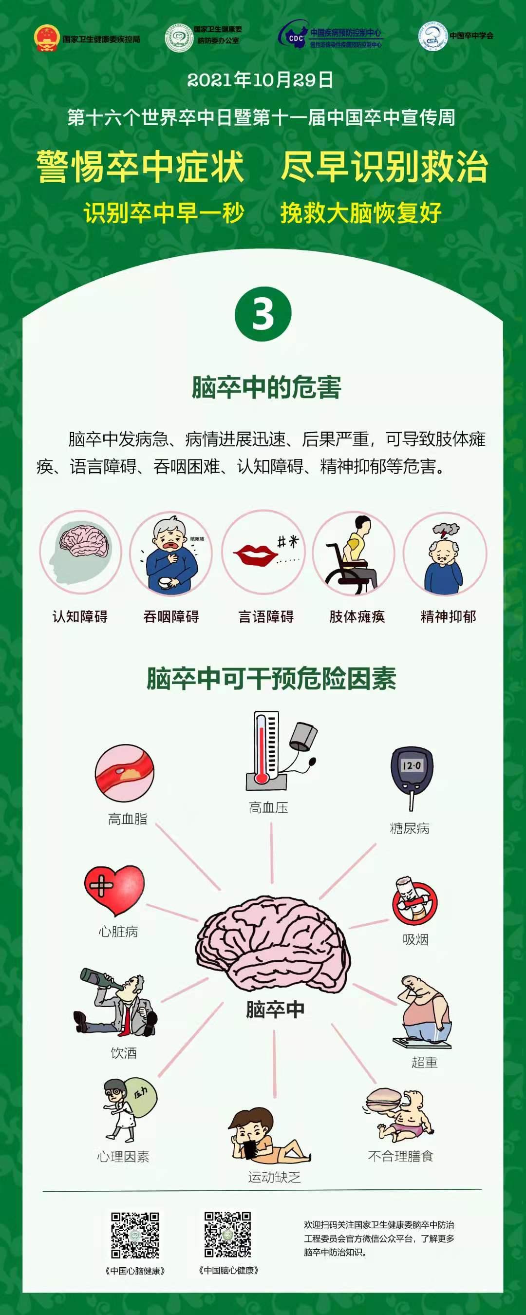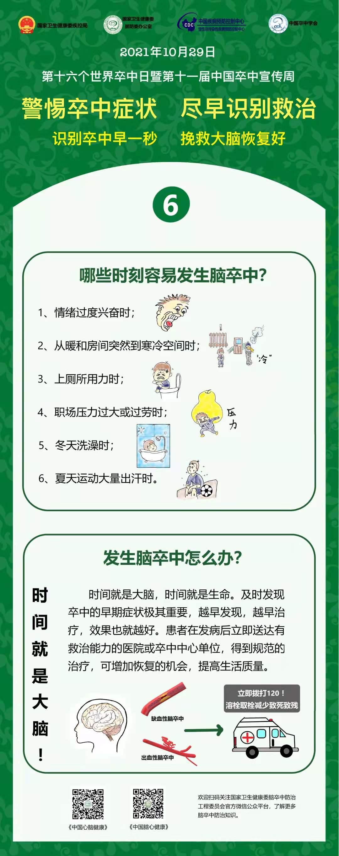 10月29日是第16个“世界卒中日”,当天,我院神经内科一病区副主任邸卫英带领医务人员,利用网络平台开展健康科普志愿活动。今年的主题是“警惕卒中症状,尽早识别救治”,口号是分秒“B”争,救治大脑,旨在提醒大家,卒中救治的核心是突出一个“早”字,早识别,早诊断,早治疗,可以显著改善患者预后,增加广大群众对卒中的认识,是做到分秒必争的基础。