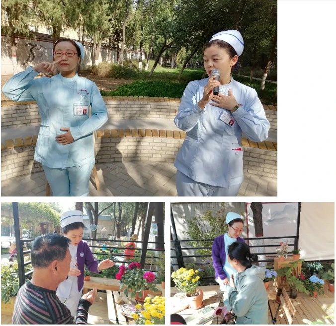 “进行呼吸操训练,第一,可以很好地加强胸、膈呼吸肌的肌肉力量与耐力,从而扩大肺活量,改善肺功能。增强中老年人抵抗呼吸系统疾病的能力。第二,心理紧张和躯体紧张是并存的,呼吸操可以帮助我们借助肌肉放松调节心理紧张,从而缓解焦虑。”主体宣讲后,苏红与张家玮一起教授大家缩唇呼吸、腹式呼吸练习。全面指导后,医护协同为公园中老年朋友进行了义诊。