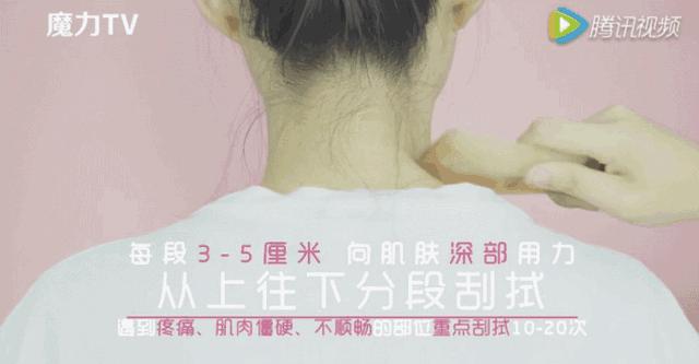 下班后,可以叫家人或者自己拿一把梳子,在颈后和肩膀处,抹点刮痧油(橄榄油也可以),反复刮拭,尤其是一些肌肉僵硬或者疼痛的地方,可以大点力度、多刮几次。