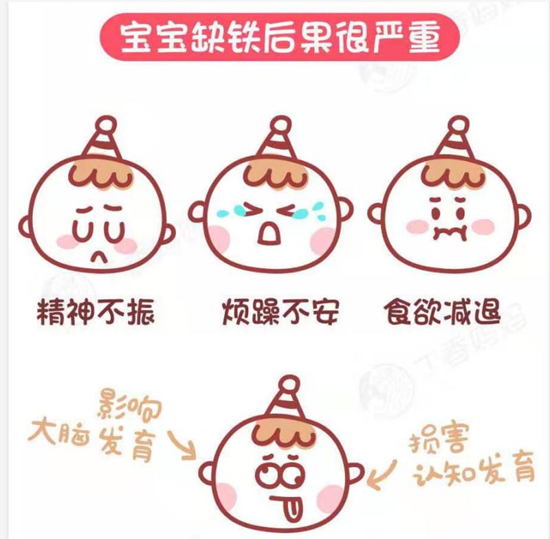 宝宝6个月时从母体内储备的铁已经消耗的差不多了,同时因为生长发育快,需铁量增多,如不及时补充铁元素很容易造成缺铁性贫血。此外,婴儿由粪便及皮肤损失的铁也较儿童和成人多[2]。