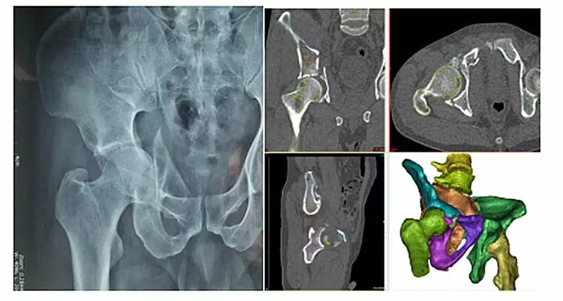 近日,我院骨外科收治一名复发骨盆骨折患者,男性,47岁,主因摔伤3小时右髋部疼痛、肿胀伴活动障碍入院。诊断为:右侧髂骨骨折、右侧髋臼粉碎性骨折、右侧耻骨骨折。经过仔细阅片后,骨外科主任焦建宝、副主任医师薛金伟认为该患者右侧骨盆存在多处骨折,且骨折断裂、移位严重。有必要应用三维可视化辅助进行术前规划及术中指导。我院医学3D影像打印中心副主任张珂经重建后发现本例患者右侧髂骨、髋臼、耻骨碎成13处之多,且多处碎骨存在移位,移位角度偏大。三维重建及手术过程都极为复杂。张珂针对该例患者连夜进行科研攻关,在最短时间重建出准确的骨盆可视化模型,并上传至三维数字云平台方便手术医生随时查看。经过精心术前规划与演练,薛金伟为患者行右侧髂骨、髋臼、耻骨骨折切开复位内固定术。患者手术顺利,手术时间较传统阅片定位后再手术的方法大大缩短,术中C型臂透视可见骨折对位、对线良好,内固定位置良好、稳定。手术结果符合术前三维重建规划预期。目前患者骨折复位质量及骨盆功能均得到良好恢复。