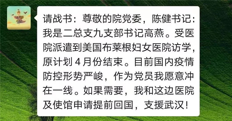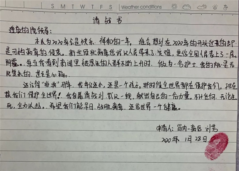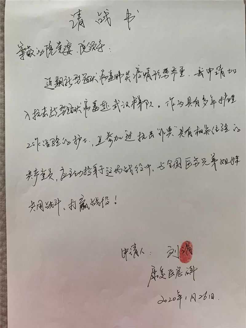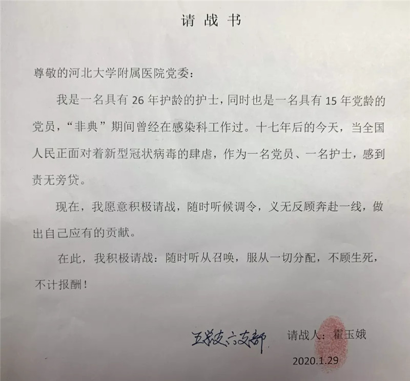 在成立第一批支援武汉的医疗队后,仍不断有请战书送到我们手中,“无论生死,不计报酬”“若有战,战必胜”“我是党员,年轻,身体好”“愿以身躯赴国难”,疫情就是命令,防控就是责任,一张张请战书表明着他们为保卫人民生命健康,无私奉献一切的决心,诠释了白衣天使救死扶伤的使命与担当。