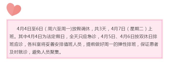 2020年清明节放假诊疗时间安排发布时间:2020/3/27 9:05:00       浏览次数:19784次