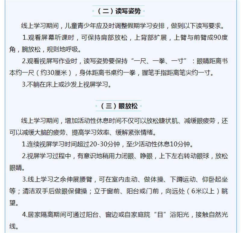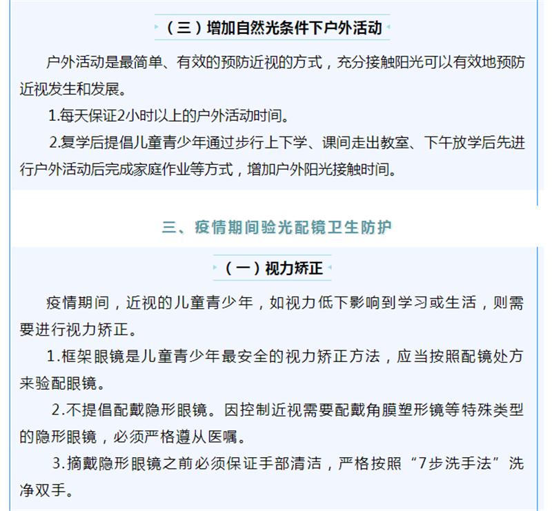 因新冠肺炎疫情,全国各级各类学校延迟开学,儿童青少年正在经历一个特殊的假期。疫情期间,儿童青少年户外活动减少,电子产品使用过多,增加近视发生和进展的风险。为指导新冠肺炎疫情期间儿童青少年近视预防,国家卫生健康委组织安徽医科大学公共卫生学院、北京市疾控中心等相关专家,制定了儿童青少年新冠肺炎疫情期间近视预防指引。