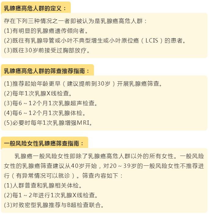 乳腺癌筛查是通过有效、简便、经济的乳腺检查措施,对无症状妇女开展筛查,以期早期发现、早期诊断及早期治疗。其最终目的是要降低人群乳腺癌的死亡率。乳腺癌发生的原因目前还不明确,但是有一些危险因素,可能与乳腺癌的发生有关。具有危险因素不一定发生乳腺癌,没必要谈虎色变,只需要在生活中加以注意,并重视乳腺癌的筛查。