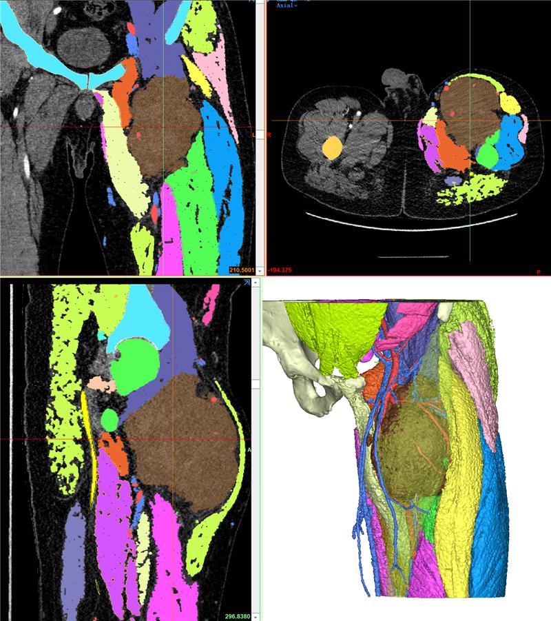 近年来患者左大腿肿物逐渐增大,遂就诊多家医院,得到的回答都是肿瘤长得太大了,肿瘤与股动静脉、股神经紧密接触,术中大出血风险非常大。患者抱着最后一丝希望来到我院门诊,当天骨外科一病区主任高文山接诊了该患者,详细了解病史及仔细阅片后,深知手术的难度,他向患者交代肿瘤周围重要神经、血管情况及术中风险,患者表示理解,遂住院进一步检查。根据前期处理复杂软组织肿瘤的经验,再次请我院科研处(医学3D影像打印中心)副主任张珂协助数字化3D图像建模。张珂根据患者的病情用3D建模技术分析图像后,才发现,患者肿瘤组织已将股动脉挤压变形,周围股静脉、股神经由于肿瘤的挤压显示不清,周围肌肉组织变薄,且股深动脉完全穿过肿瘤组织。术中对于股动脉的处理极为重要,稍有不慎可能血管破裂致大出血,因患者6年前深静脉血栓与肿瘤组织压迫静脉,导致静脉回流有关,如肿瘤进一步增大,可能导致股动脉血流障碍,影响患肢血运,严重致下肢缺血坏死,手术不做不行。