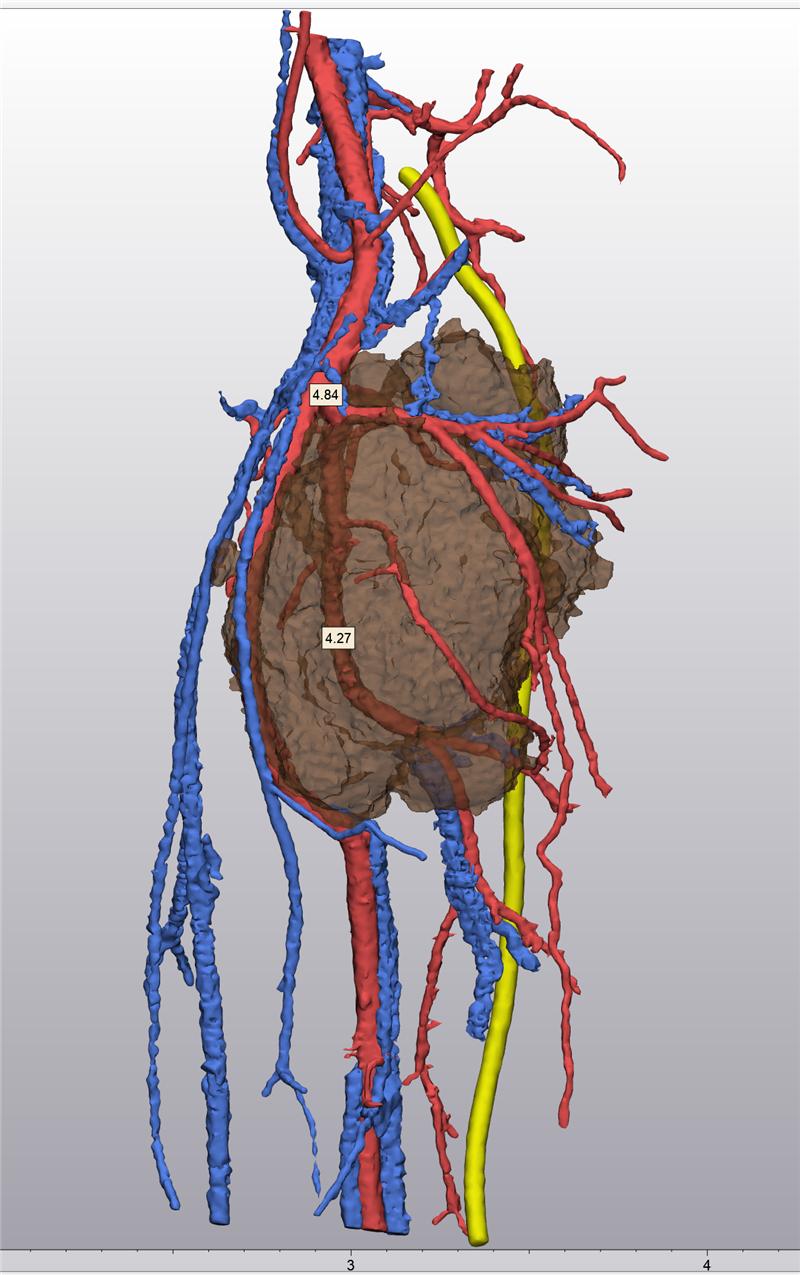 根据相关数据资料,高文山提前规划了患者术中体位及手术切口设计,术中肿瘤边界到瘤体血管分布情况及术中如何处理,尤其是对于股动脉的保护,术前数字化3D图像建模给手术提供了精准导航,重要动脉的走形甚至动脉小的分支也能清楚显现,为术中血管的处理提供了依据。