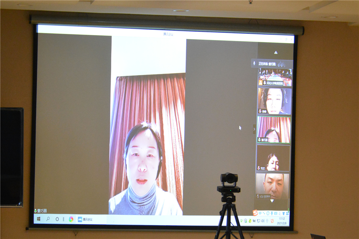 视频连线中,省级专家、我院呼吸与危重症医学科负责人李峥,第三批医疗队领队、我院医务处副处长董巧丽,第一批医疗队临时党支部书记、我院重症医学科副主任崔娜,第三批医疗队临时党支部书记、我院内科护士长毕朝煜分别向院党委汇报了医疗队支援河北省胸科医院、石家庄市人民医院和石家庄市第五医院救治工作情况、临时党支部工作情况和医疗队生活情况,表示一定坚守工作岗位,完成节日期间救治工作,以优异的工作成绩向河北大学党委、医院党委和全校师生、全院干部职工汇报。之后,倪志宇、程树杰等院领导与队员进行了视频交流,倪志宇、程树杰说,医疗队全体队员在救治一线的不同岗位上发挥光和热,做出了成绩,院党委和全院干部职工为你们骄傲和自豪,今天有的队员由于在工作岗位上,没能连线见面,非常遗憾,请一定要转达院党委和全院干部职工对大家的新春问候和诚挚祝福。
